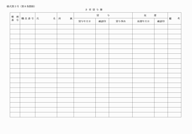 第8条 人事担当係は、き章の貸与の状況を明らかにするため、き章貸与簿(様式第3号)を備えなければならない。