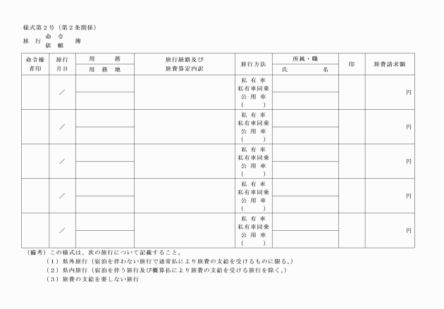 第10条 職員が出張命令を受けて旅行する場合において、私有車を使用しようとするときは、あらかじめ私有車公務使用許可申請書(様式第3号)を所属長を経て広域連合長に提出し、許可を受けなければならない。