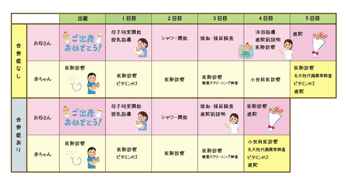 (妊娠中の合併症の状況やお母さんと赤ちゃんの状況により、変更があります。)