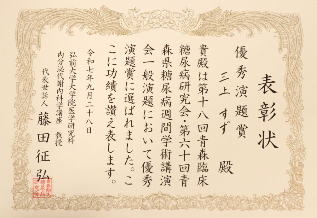 この度、第十八回青森臨床糖尿病研究会・第六十回青森県糖尿病週間学術講演会一般演題において、優秀演題賞という大変光栄な賞を賜りました。