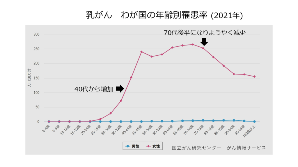 わが国の乳がんの特徴として、ほかのがんに比べ発症の年齢が低く、40歳代から50歳代60歳代といった、家庭や社会の中心となっている世代の患者さんが多いことがあげられます。